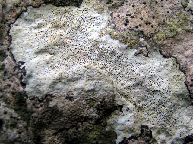Il tallo rosa mi fa piuttosto pensare a Acrocordia conoidea. I periteci di A.gemmata sono pui piccoli (0,5-1mm)e il tallo bianco o grigi chiaro. Che ne pensate ?