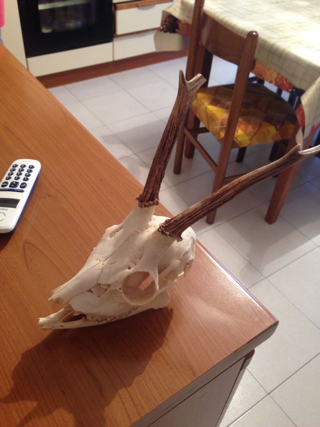 Le stanghe sono lunghe 17 cm circa la sx e 16 cm la dx, che sembra spezzata in punta (dai contorni arrotondati penso si sia rotta quando l'animale era ancora in vita). Le fosse lacrimali, la struttura del cranio e dei denti non lasciano dubbi sul fatto che sia un capriolo va detto però, come giustamente hai fatto notare te, che le stanghe risultano più allargate e sottili di altri crani di capriolo in mio possesso.. Tuttavia vi è una notevolissima differenza da reperto a reperto. Ad esempio ne ho 3 simili al tuo, ma anche un altro con le stanghe ancora più divaricate, quasi a formare una "U" (anche se purtroppo quest'ultimo risulta abbastanza danneggiato),  |