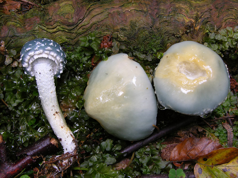 anche se gli esemplari maturi potrebbero essere scambiati per Stropharia caerulea, la cortina consistente dell'esemplare giovane e il filo delle lamelle dell'ultima foto non lascia dubbi si tratta sicuramente di Stopharia aeruginosa. Come sempre le foto sono veramente belle!!!