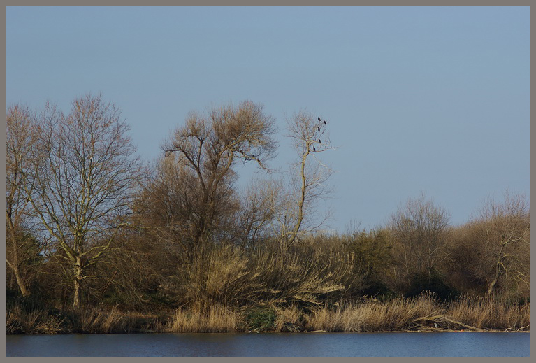 Sono stato fortunato. Solo una decina di cormorani appollaiati cento metri più in là, sugli alberi oltre il fiume che osservano in mistico silenzio la mia esplorazione.
