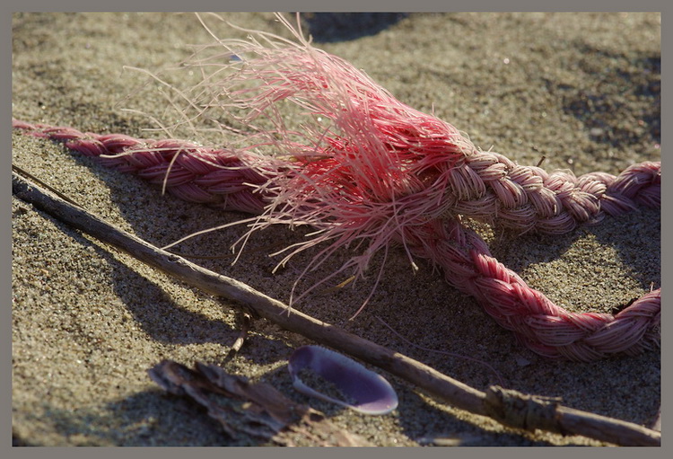 Proseguendo fra cespugli di Ammophila littoralis e di Euphorbia paralias mi dirigo verso la foce del fiume delimitata da alcuni isolotti che tenderanno a creare sbarramenti nel corso dell'estate quando il fiume sarà in secca. Quello è l'ultimo tratto che precede l'inizio della spiaggia libera dove l'abbondanza dei rifiuti è talmente rilevante che si percepisce netto il senso d'infeltrimento dell'anima.