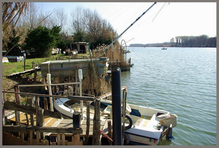 Percorro il vialetto che costeggia queste piazzole penetrando di tanto attraverso delle scalette che arrampicano il basso argine. Provo per un istante ad immaginare quello stesso posto in luglio, in agosto. La suppellettile d'uso balneare che abbonda ammonticchiata sotto teloni ripiegati fa dedurre che almeno duemila persone frequenteranno in pianta stabile quel tratto di sponda pullulante di casine mobili, prefabbricati, garage in muratura e metallici. E per qualche istante odo il vociare dei bambini, i motori delle barche in moto, i gabbiani che si affollano gridando a divorare i rifiuti, lo sghignazzare senza misura delle tavolate ebbre di buon vino.