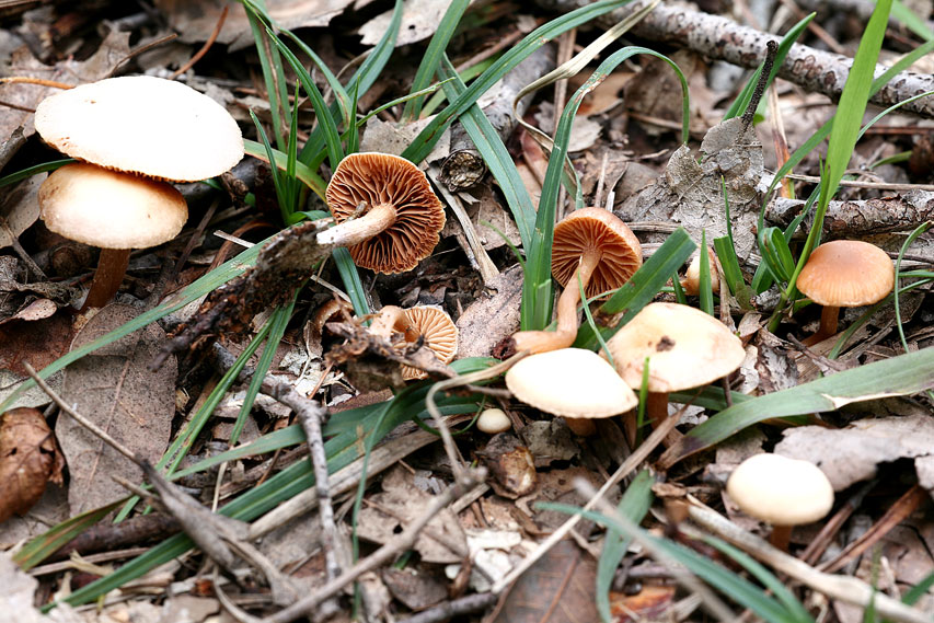 Ciao amici, i residui velari confinati al margine del cappello che mi sembra di vedere in almeno due esemplari mi farebbero pensare a una qualche Pholiotina... Sentiamo anche altri...