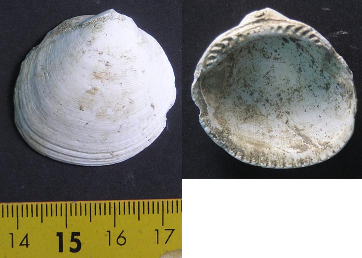 Forma circolare, leggermente inequilaterale, valva dx. Bordo anteriore arrotondato, bordo posteriore leggermente smussato. Colore bianco crema sia all’interno che all’esterno in parte dovuto alla depigmentazione causata dalla lunga permanenza nel sottosuolo. Strie radiali sottili non ben percettibili, coste concentriche di accrescimento ben marcate. Tassodonte, dimiaria, isomiaria, integropalleata.