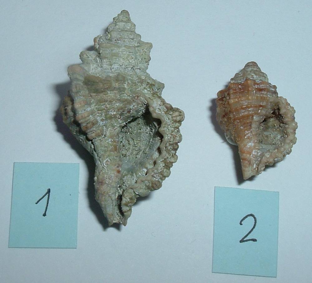 Se sono fossili del Tirreniano - Pleistocene superiore ( 70.000 a. )la loro origine è da specie Anfiatlantiche ed essendo due specie di Cimathium la 2 si avvicina a C. ficoides , la 1 non mi sembra specie di Cimatium segnalata per questo periodo in Mediterraneo.