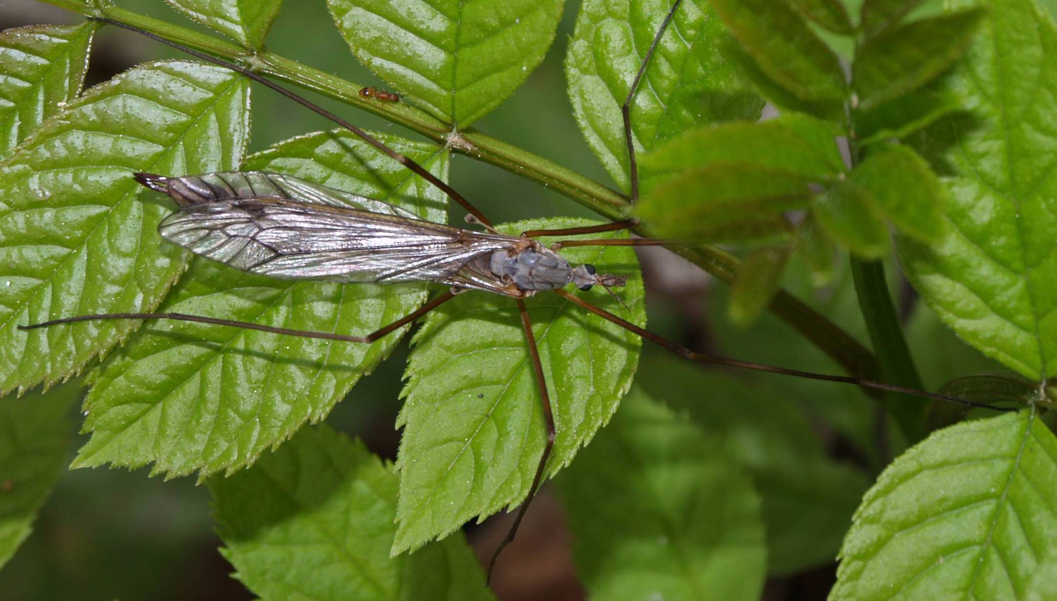 poco distante stava invece questo "zanzarone", è possibile determinare anche questo?...azzarderei interessante il confronto con la piccola formichina in alto sul rametto...