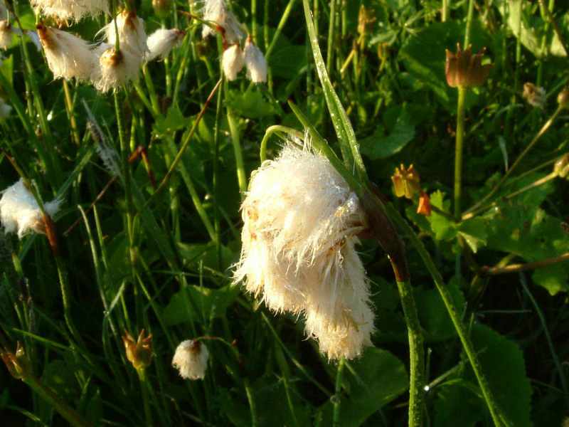il genere potrebbe essere Eriophorum, la specie è difficile da capire (almeno per me che non sono esperta!) perchè è molto difficile e la pioggia non aiuta! La differenza tra E. scheuchzeri e E. angustifolium ad es. è il numero di spighe (1 per la prima, da 2 a 7 per la seconda) inoltre ti posso dire che la prima è più comune mentre la seconda è più difficile da trovare. C'è poi la E. vaginatum ma è rara e non mi sembra si tratti di lei perchè dovrebbe trovarsi a cespugli.
