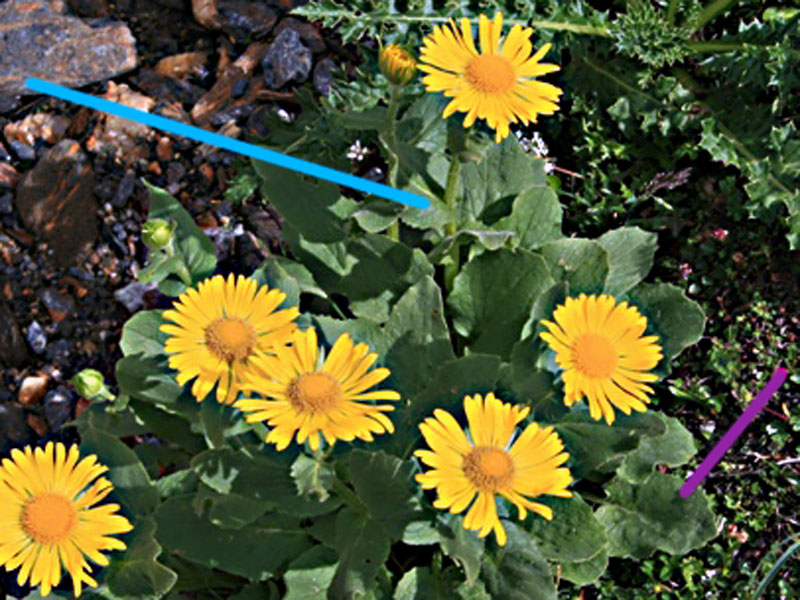 E se fosse Doronicum columnae Ten. ? Piante di regola monocefale dell'arco Alpino (Pignatti,1982,3: 114): 4052 D. grandiflorum Lam, - vedere ipotesi hanscastorp 4054 D. clusii (All.) Tausch - vedere ipotesi Alessandro 4049 D. columnae Ten. ipotesi blcamuno perchè: a) il fi. centrale in alto sembra avere il f. nudo nella 1/2 sup. b) la 1a fg. sottostante sembra semiamplessicaule (indicata in blu nell'ingr.) c) la fg. (basale?) indicata in rosso nell'ingr. è picciolata e la lamina sembra cuoriforme. I fiori bianchi che compaiono in basso sembrano di Saxifraga stellaris, pianta di luoghi umidi, come D. columnae. Escludo l'altro D. monocefalo delle Alpi (D. glaciale) perchè ... non lo conosco. Non punterei una palanca buca sulla validità botanica della mia chiaccherata ferragostana. Mi scuso con Flavia dell'ingrandimento della sua foto senza permesso preventivo. Spero capisca lo spirito con cui ho operato.