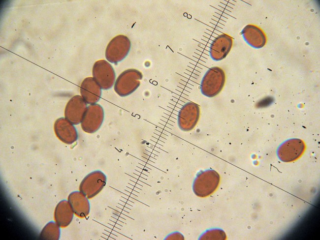 Esporas de color marrón claro, lisas, con poro germinativo, elipsoides o algo arriñonadas, de 7-8 x 4-5 micras. Basidios claviformes, tetraspóricos. Queilocisticios raros, claviformes, utriformes, langeniformes, de 40-70 x 9-14 micras, mezclados con abundantísimas células marginales claviformes o utriformes, septadas a veces, de 30-40 x 10-13 micras. Pleurocistidios hialinos, utriformes, abundantes, de 35-60 x 9-12 micras. Epicutis en himenodermis, constituída por células globosas o subglobosas.