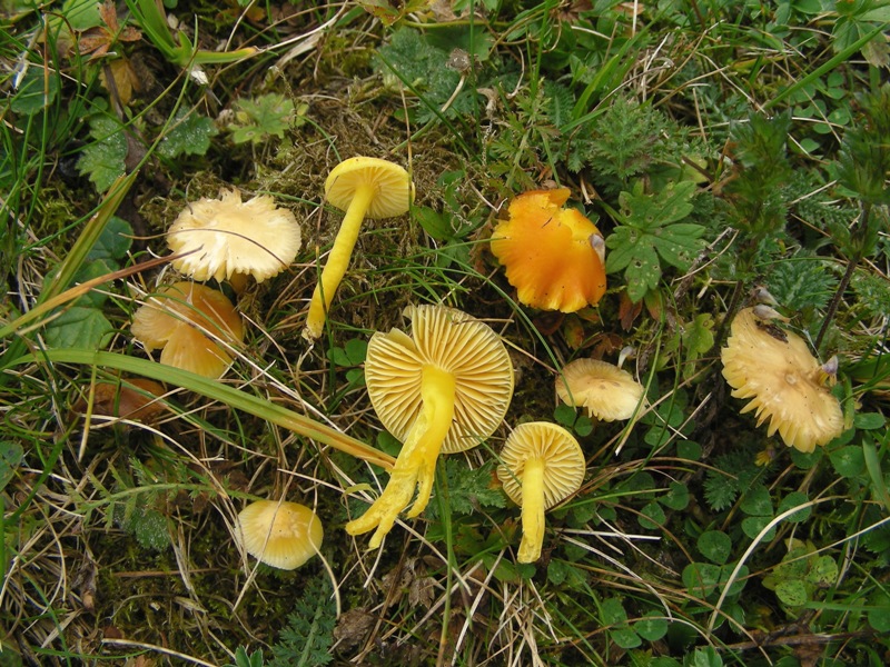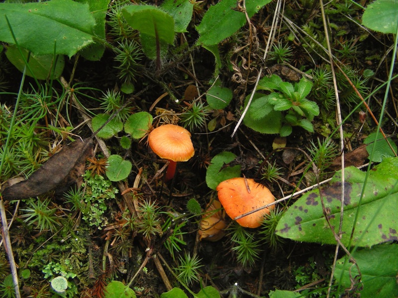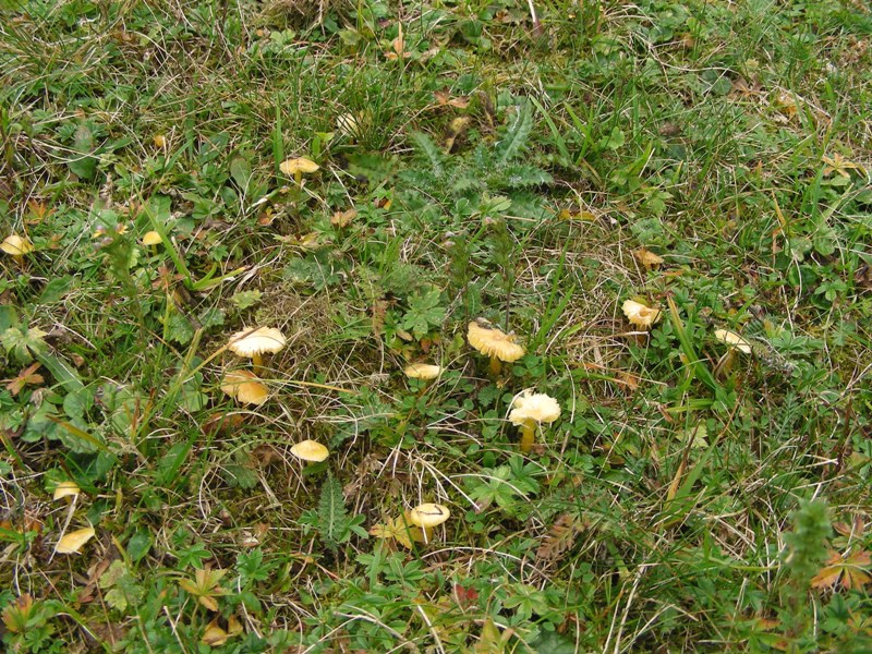 2)Altra Hygrocybe probabilmente indeterminabile, la metto per dovere di cronaca. Anche qui piccole dimensioni, 3cm massimo presente in un sito di una decina di metri di diametro in 5/6 gruppi distinti di centinaia di esemplari, praticamente concresciuti e frammisti agli esemplari della "zona" Psittacina già postati nel forum: