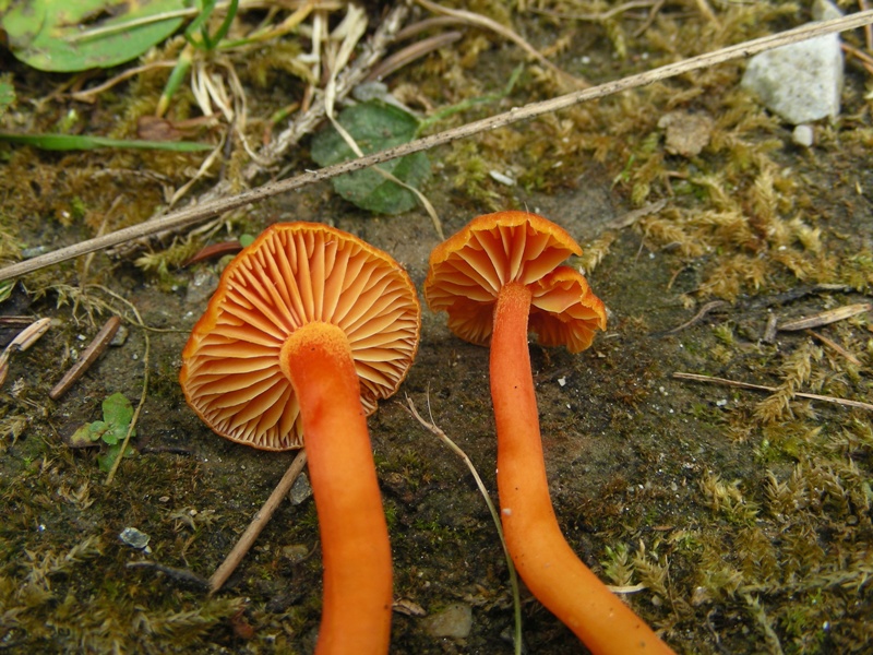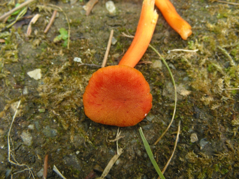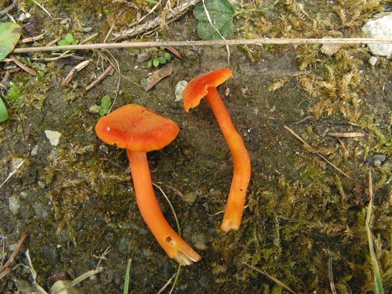 Ultima, altra Hygrocybe a me sconosciuta ma che pare avere qualche peculiarità in più. Cappello in un certo senso feltrato, per intenderci simile ad una Laccaria, lamelle non decorrenti, gambo slanciato con la stessa feltratura del cappello nell'ultimo tratto, altezza 5cm circa.