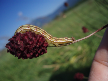 Lavorando a un progetto su Maculinea teleius e Lycaena dispar vicino a Gorizia il 24. di agosto ho trovato questi bruchi che mangiavano i fiori della Sanguisorba officinalis. Sapete dirmi a quale specie appartengano? Come sono fatti i bruchi di Maculinea teleius?E' vero che sono picolissimi e che mangano i fiori della sanguisorba formando una spirale?