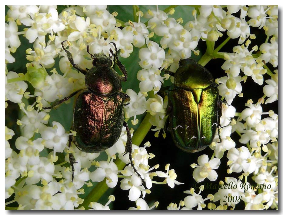 Se vi capitasse di incontrarla potreste invece a prima vista scambiarla per una Cetonia aurata (come già ricordavo nel precedente post): ma basta prestare un po’ d’attenzione per scorgere evidenti differenze con quest’ultima. In Croazia ho per caso notato, su di un'ombrellifera, la contemporanea presenza di entrambe le specie e non mi sono certo lasciato sfuggire la ghiotta occasione di scattare una “foto ricordo” che le immortalasse una vicina all’altra: