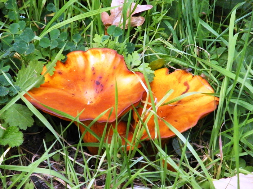 Ciao Dudy, crescita fascicolata probabile Omphalotus olearius su sedimenti legnoli a pelo d'erba... anche se l'inquadratura non è delle migliori...