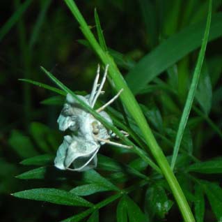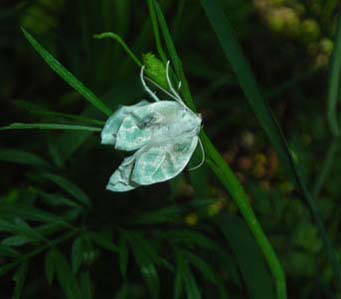 è un adulto di Geometridae di quelli verdi, tipo Hemistola chrysoprasaria per intenderci (ma non dire che è lei e che te l'ho detto io! anche se dal colore verde glauco e dalla linea bianca singola che sembra esserci sulle ali potrebbe anche essere proprio lei...) con le ali accartocciate