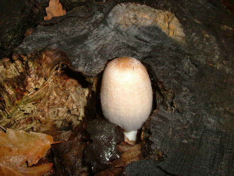 In collina,bosco di latifoglie.Nell'incavo di una ceppaia di quercia,su foglie marcescenti.Si tratta di Coprinus.......grazie
