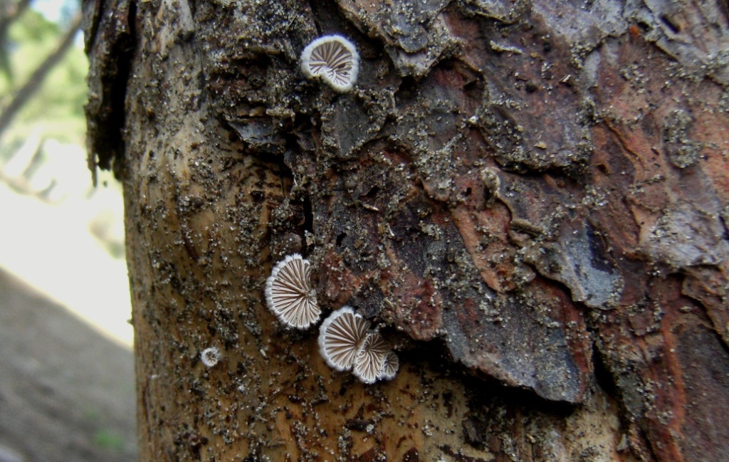 Ciao, a me sembra Schizophyllum commune, un buon particolare identificativo dovrebbe essere quello delle lamelle doppie.