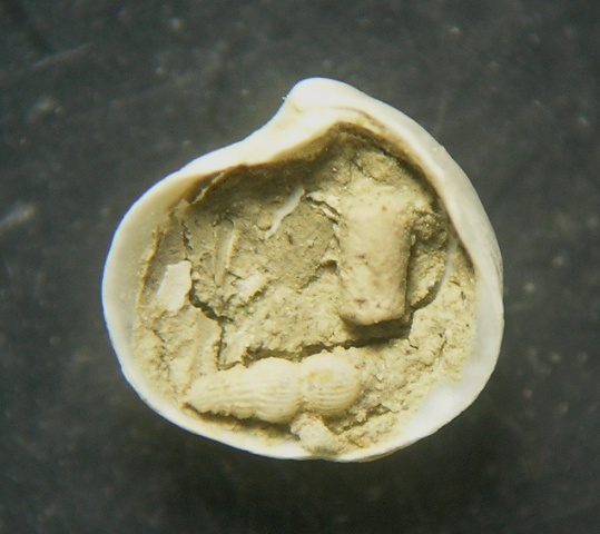 Rettifico intanto le dimensioni, h 2,5 mm. Per quanto riguarda i caratteri, dovremmo esserci esternamente, la cerniera invece non torna, in base alle note di cui sopra in questa valva dovrebbe esserci una sorta di "dentino" che poi dentino non è ma inspessimento della conchiglia, che non mi pare in effetti di vedere, aggiungo due foto forse riuscite meglio.