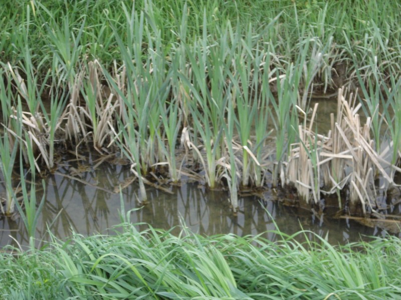 L'ascella delle foglie penso posa tornare molto utile: in Iris tuttle le foglie sono sullo stesso piano, a ventaglio, in Typha invece, quardando il "ventaglio" le foglie appaiono di profilo.
