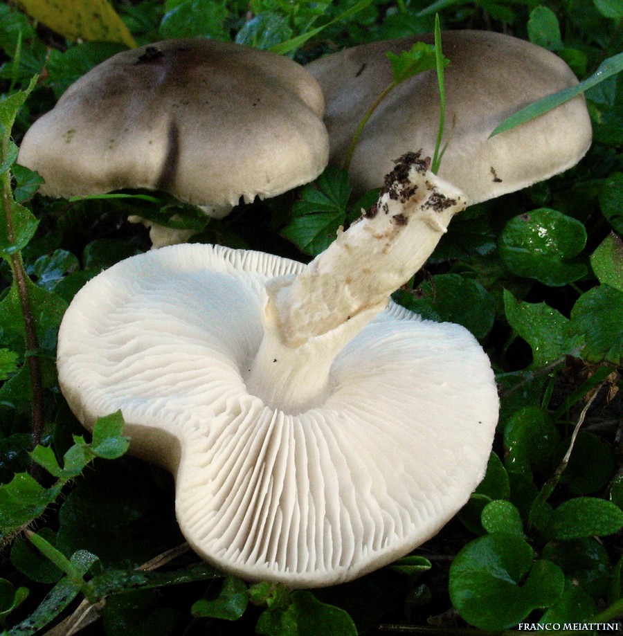 Cappello: convesso, abbastanza regolare ma un po' lobato, con superficie pileica liscia, sericea, colore fonfamentale grigio topo, appena sfumato di nocciola, bordo leggermente più chiaro. Lamelle: sinuato-smarginate, bianche, con lamellule, bordo leggermente seghettato. Gambo: bianco con anello appendicolato; superficie del gambo liscia con leggere striature verticali sopra l'anello, irregolarmente flocculosa sotto l'anello.