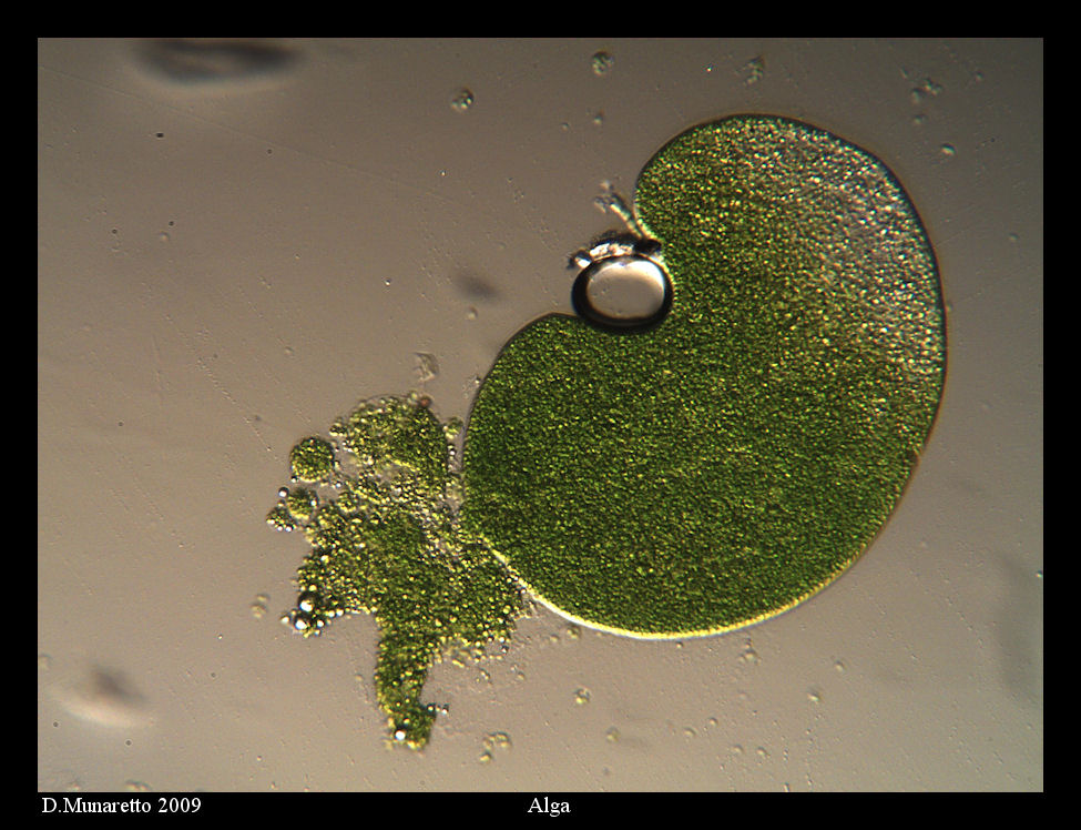 A me sembra che l'acqua stia entrando, quindi direi il contrario: Lisi indotta da una soluzione ipoosmotica. Infatti essendoci una bassa concentrazione di soluti(ioni e molecole di vario tipo) nella soluzione e una concentrazione maggiore nell'alga l'acqua si sposta (per diffusione secondo gradiente) in quest'ultima. Essendo alta la differenza di potenziale osmotico l'eccessivo ingresso d'acqua porta alla lisi del sistema.