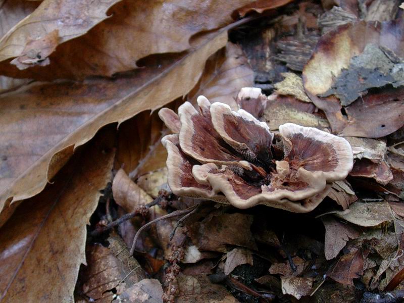 Provo...secondo me si tratta di Phellodon tomentosus (L.:Fr.)Banker. Questa specie, che cresce in gruppi di numerosi individui nei boschi di conifere o misti, si caratterizza per il cappello più o meno circolare in visione polare, depresso nella zona centrale, con superficie rugosa radialmente e zonata concentricamente, bruno rossastra e con margine regolare, sottile, biancastro; imenoforo decorrente, formato da aculei lunghi fino a 3 mm, biancastri o grigiastri; gambo, generalmente più o meno cilindrico, talora incurvato, di colore bruno, liscio o fibrilloso; carne con consistenza suberosa, zonata, brunastra nel cappello, bruno-rossastra altrove; odore di preparato per brodo e sapore amarognolo.