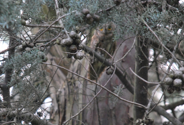 Se non fosse per quegli occhioni gialli come fari direi che è quasi impossibile scorgerlo nel folto della chioma degli alberi. E di conseguenza riuscire a metterlo a fuoco nella fotocamera!