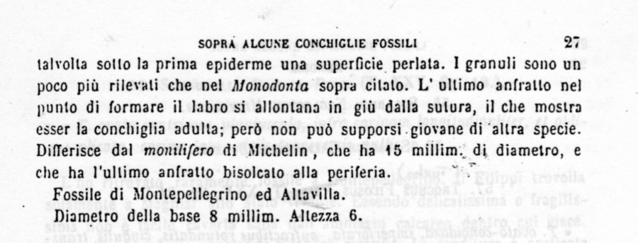 In effetti penso che Tino abbia ragione, avevo notato la cosa tempo addietro, poi, in occasione di questa discussione l'avevo completamente rimossa ed è stato lui a farla riaffiorare. Per analizzarae a fondo la cosa, quindi direi di partire dalla descrizione originale del Libassi, 1859. Memoria sopra alcune conchiglie fossili dei dintorni di Palermo: Immagine:
