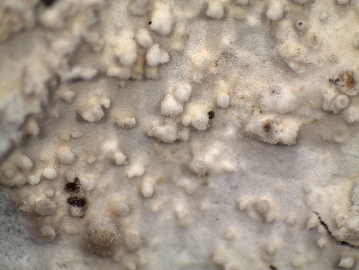Crescita su branca di latifoglia Carpoforo resupinato di colorazione bianco/crema; superficie imeniale raduloide.
