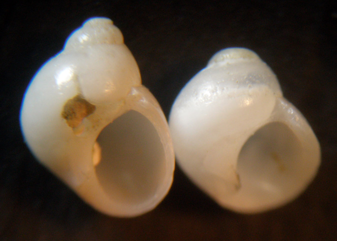 generalmente quando sono così spesse è perché sono frammenti di conchiglie più grandi; nel tuo caso per l'esemplare a sinistra direi una Tricolia, per l'altro penso non valga la pena fare ipotesi dato che è ancora più fluitata