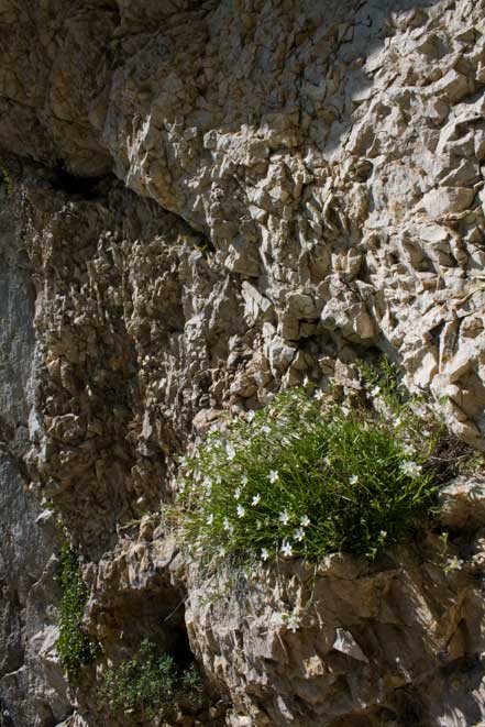 104,11 KB La stazione di M. graminifolia del M. Catria riveste un indubbio valore biogeografico. E’ infatti il sito più settentrionale dell’Appennino, oltre ad essere nettamente isolato rispetto alle più vicine stazioni, che si trovano sui Sibillini. Quando, esattamente 15 anni fa, durante un’escursione con gli amici del Centro Ricerche Floristiche Marche (Pesaro), in una delle zone più impervie del Catria, l’occhio “clinico” del dott. Leonardo Gubellini, ora direttore di quel Centro, individuò un solitario e interessante cespuglietto, abbarbicato ad una parete rocciosa, ci risultò subito chiaro di aver scoperto qualcosa di veramente interessante. Era evidentemente una cariofillacea insolita per la nostra montagna. Seguendo Zangheri la determinai come M. graminifolia ssp. clandestina. In effetti però Pignatti e Flora Europaea escludevano la presenza di questa ssp. in Italia, limitandola alla sola penisola balcanica. Ora un recente lavoro (vd.: Conti) ha diviso il gruppo di M. graminifolia in 5 sottospecie: graminifolia, hungarica, rosani, brachypetala e clandestina. La ssp. graminifolia sarebbe limitata alle Alpi orientali, mentre le popolazioni appenniniche si dividono tra la rosani (endemica appenninica, che nel Forum è citata qui) e la clandestina (anfiadriatica, perché diffusa anche nella penisola balcanica).