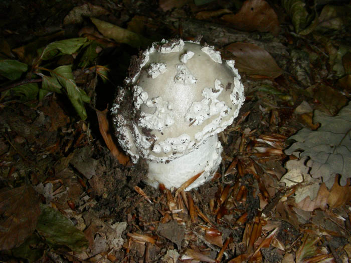 Stesso bosco, un centinaio di metri di distanza, in pecceta pura e fitta, questo esemplare. Anch'esso piuttosto infossato nel terreno, però con evidenti verruche e letteralmente mastodontico: 6 cm di diametro del gambo, altezza stimata attorno ai 20cm, un vero spettacolo. Sono tornato due giorni dopo sperando di ritrovarla nel pieno sviluppo ed ho trovato solo un grosso foro, evidentemente qualcuno l'ha raccolta come "trofeo" da portare alla vicina malga con agriturismo. Comunque, stiamo parlando sempre di Amanita excelsa? La fantomatica excelsa var. spissa, che dovrebbe corrispondere abbastanza a questo carpoforo, esiste?