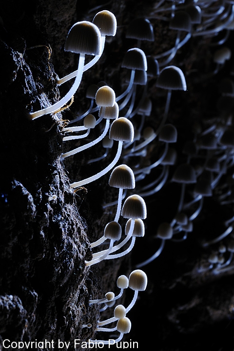 I funghi potrebbero essere dei Coprinellus disseminatus, tra l'altro abbiamo un topic apposito per i ritrovamenti dei funghi in grotte ed affini e sposteremo lì la discussione.