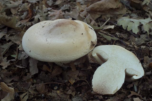 l'aspetto tozzo, malgrado lo stadio giovanile, ed il margine del cappello fortemente involuto mi fanno pensare a Leucopaxillus (Tricholomataceae). Un odore particolare (tipo "barba" di pannocchia/cetriolo), se non ricordo male, indirizzerebbe verso L. macrocephalus, che dovrebbe avere toni più scuri di L. candidus.