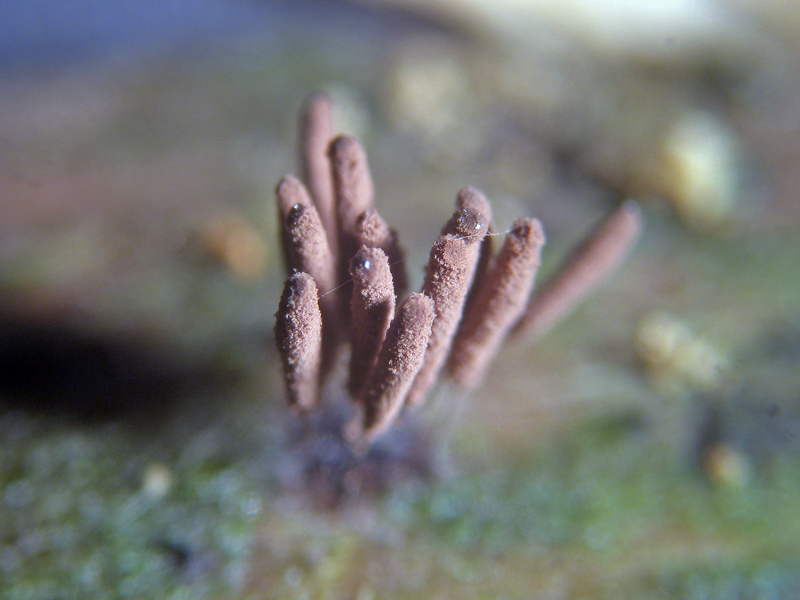 Stemonitis di piccole dimensioni, meno di 5 mm rispetto al doppio e più che incontro di solito; bosco misto di Morazzone in prov. di Varese, come sempre su un tronco marcescente. Le immagini sono allo stereo a 20x; il lato lungo corrisponde a 7,5 mm; le spore al microscopio ottico a 1000x. Se qualcuno conosce la specie o mi indica cosa osservare per determinarla è come sempre benvenuto