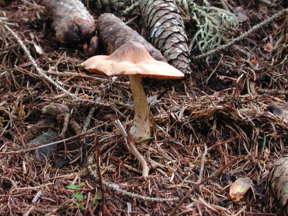 benvenuto nel forum micologico. Le foto sono abbastanza "eloquenti", almeno per attribuire al Genere Cortinarius questo ritrovamento (sottosez. Telamonia?). Più complesso, almeno per me, ipotizzare la specie dal momento che entrano in gioco elementi morfologici, macro-chimici ed ecologici di non trascurabile importanza.