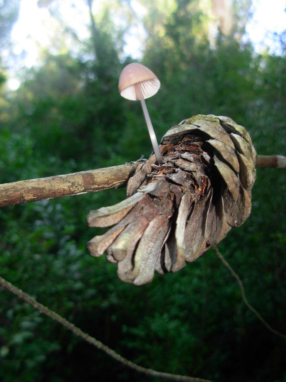 Salve a tutti, pur non essendo un micologo ma impegnato soprattutto sul fronte della botanica, sicuramente non sono indifferente nei confronti del mondo dei funghi. L'altro giorno, durante una camminata in un bosco misto di leccio e pino, alzo gli occhi e ti vedo quello che non mi era mai capitato di vedere, un funghetto che cresce su una pigna. Ma non una pigna caduta, bensì una che è attaccata al ramo a circa due metri e mezzo di altezza! Beh, come ho già detto, non ho la più pallida idea se questo sia un fenomeno raro oppure no, né se sia possibile identificare questa specie dalle foto che ho allegato. Tuttavia, da neofita totale quale sono, mi fa piacere condividere con voi questo ritrovamento. Ciao