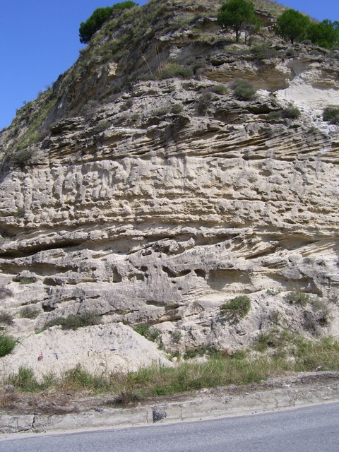 Sulla carta geologica del luogo riporta, per quell'area, una sequenza argilloso-arenacea, ma a me sembra di distinguere almeno tre formazioni, anche perchè nella parte centrale della foto mi sembra di vedere una formazione delimitata sia alla base che al tetto da una trasgressione o discordanza.