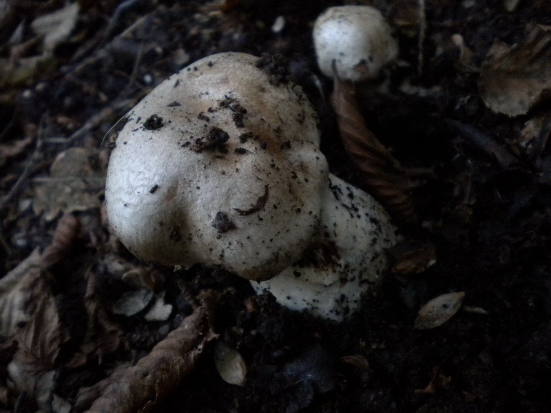 In un bosco di carpini,nascosto tra la folta lettiera di foglie.Penso sia un Cortinario si nota ancora il velo.Carne leggermente grigiastra con lamelle di un color marroncino.Cappello biancastro-grigio chiaro sporco.Grazie
