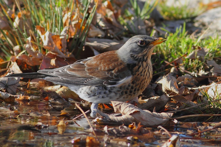 Mi piacciono molto i riflessi sull'acqua e l'armonizzazione tra i colori dell'uccello e quelli delle foglie morte e delle pietre sullo sfondo.