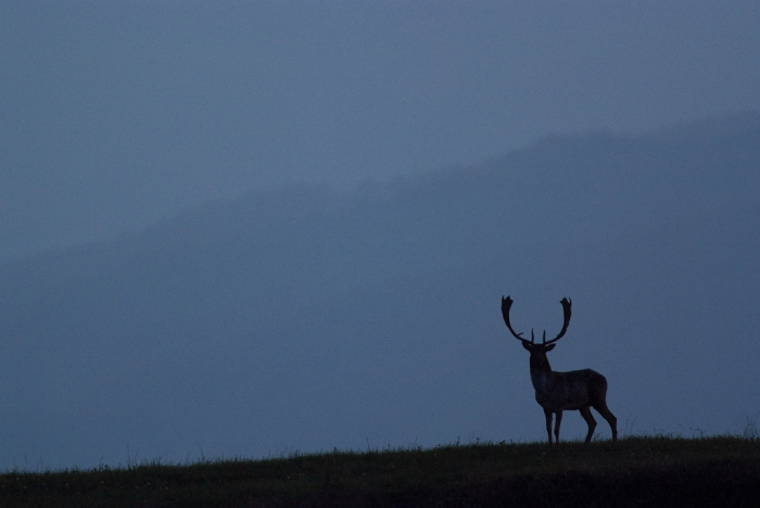 Interessantissima immagine. Mi sono permesso di proporre una elaborazione anch'io; se non vuoi che manipolo l'immagine la cancello subito  Ho lasciato "l'effetto notte", che trovo molto suggestivo, scurendo leggermente la foto in modo da ottenere solo la silouette del daino e dell'erba in primo piano. Poi un tocco al contrasto per accentuare il blu profondo delle colline sullo sfondo. Infine ho tolto un po' di rumore con il programma PhotoImpact 6: l'immagine risulta più "morbida", quasi sfumata, ma nell'evanescenza del crepuscolo dà un effetto di inafferrabilità... Ho esagerato?