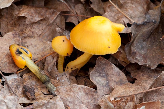 Ho trovato il funghetto con il cappello ancora chiuso a circa 50 cm dagli altri e lì per lì ho dato per scontato che fossero la stessa cosa. Rivedendo le foto però mi sorge il dubbio che siano 2 specie diverse. non riesco a trovare tra i miei libri una Hygrocybe a cappello e gambo giallo annerente al tocco. Poi quelli in gruppo sembrano avere delle ornamentazioni sul gambo che il funghetto da solo non ha. in conclusione potrebbe essere: fungo sdraiato ed annerente Hygrocybe conica e gli altri Hygrocybe crocea?